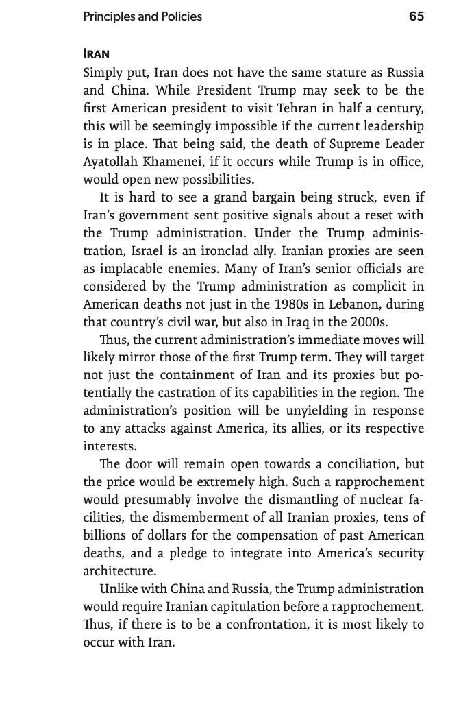 The White House’s Iran policy flows from its overall approach to the Middle East and to adversarial countries around the world. This is covered in Trump 2.5: A Primer across several excerpts.
